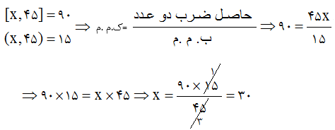 ب.م .م دو عدد 15 و ک. م. م آن ها 90 می باشد. اگر عدد بزرگ تر 45 باشد، عدد کوچکتر کدام است؟
