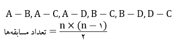 حالا با 4 نفر حساب کنیم. هر نفر 3 مسابقه می‌دهد، یعنی یکی کمتر از تعداد تیم‌ها و در پایان باید تعداد همه‌ی مسابقه‌ها را نصف کنیم.