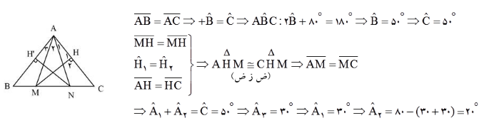 در مثلث  داریم  و . عمود منصف‎ها دو ساق مثلث، قاعده‎یBC را در M و N قطع می‎کندکوچک‎ترین زاویه‎ی مثلث AMN چند درجه است؟