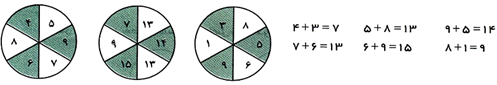 حل: اعداد داخل دایره ی مرکزی از جمع اعداد دو دایره ی کناری به دست آمده اند: