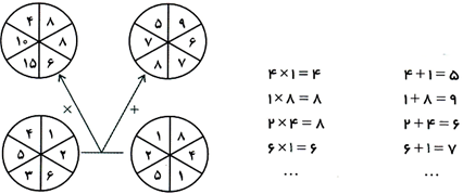 حل: اعداد داخل دایره ی سمت چپ بالایی، حاصل ضرب و اعداد داخل دایره ی سمت راست بالایی، حاصل جمع اعداد داخل دو دایره ی پایینی هستند: