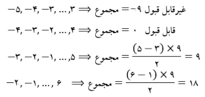 با حدس و آزمایش شروع می کنیم، ابتدا مجموع 9 عدد متوالی را از 5- تا 3+ در نظر می گیریم، مجموع آنها می شود 9- پس قابل قبول نیست زیرا طبق صورت سوال بایستی مجموع نامنفی باشد. بنابراین از 4- تا 4+ را در نظر می گیریم که مجموع شان می شود صفر پس قابل قبول است چون نامنفی است. به همین صورت ادامه می دهیم: