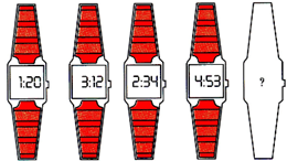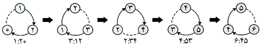 حل: از چپ به راست، اگر ارقامی که هر یک از ساعت ها نمایش می دهند را به صورت یک دایره (مانند شکل زیر) فرض کنیم، به هر رقم یک واحد افزوده شده و ترتیب اعداد هر بار یک رقم ساعت گرد تغببر کرده است. (یک رقم به چپ حرکت کرده)
