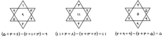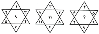 حل: در هر ستاره، مجموع سه عدد پایینی از مجموع سه عدد بالایی کم شده و عدد وسط به دست آمده است: