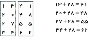 راه حل اوّل: اگر دو ستون سمت چپ را یک عدد دو رقمی و دو ستون سمت راست را یک عدد دو رقمی دیگر در نظر بگیریم، عدد سمت راست 28 تا بیشتر از عدد سمت چپ است: