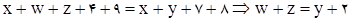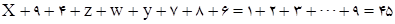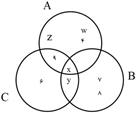 عناصر 1، 2، 3 و... 9 عضوهای سه مجموعه‌ی A ، B و C هستند. به جز 4 عضو x ، y ، z و w بقیه‌ی عضوها در شکل زیر نشان داده شده‌اند. اگر مجموع عضوهای هر سه مجموعه با هم برابر باشند، مقدار x کدام است؟