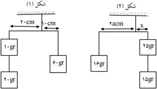 در شکل (1) زهرا پروژه اش را ارائه داده است و آن را به صورت متحرک از سقف کلاس آویزان کرده است که به خوبی تعادل دارد. در شکل (2) سارا نیز می خواهد پروژه اش را به همان شکل نشان دهد. طول x چه قدر است تا پروژه اش به خوبی تعادل داشته باشد؟