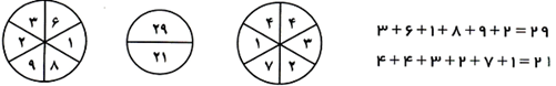 مجموع اعداد داخل دایره ی سمت چپ در بالای دایره ی وسط و مجموع اعداد داخل دایره ی سمت راست در پایین دایره ی وسط نوشته شده است.