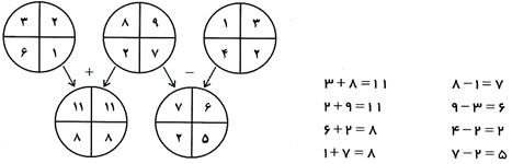 حل: دایره ی سمت چپ پایینی، مجموع دو دایره ی بالایی سمت چپ و دایره ی سمت راست پایینی، اختلاف دو دایره ی بالایی سمت راست است: