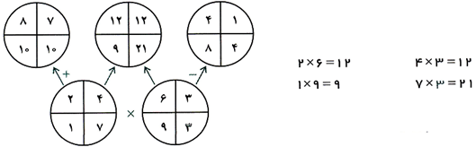 حل: اعداد داخل دایره ی وسط بالایی، حاصل ضرب اعداد دو دایره ی پایینی هستند:
