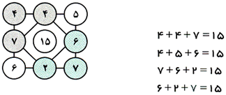 حل: مجموع اعدادی که در رأس هر مثلث قرار گرفته اند، 15 است: