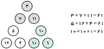 حل: مجموع هر سه دایره ی کنار هم 21 است: