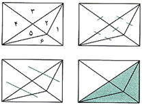 حل: در شکل 6 مثلث یک قسمتی، 6 مثلث دو قسمتی، 2 مثلث سه قسمتی و 1 مثلث چهار قسمتی و در مجموع ۱۵ مثلث وجود دارد.