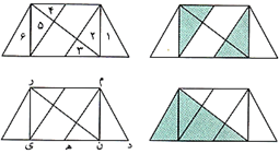 حل: درشکل ۶ مثلث یک قسمتی، 4 مثلث دو قسمتی، ۳ مثلث سه قسمتی و ۱ مثلث چهار قسمتی و در مجموع 14 مثلث وجود دارد.