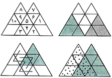 حل: در شکل ۱۰ مثلث یک قسمتی، ۲ مثلث سه قسمتی، ۴ مثلث چهار قسمتی، ۲ مثلث هشت قسمتی و در مجموع 18 مثلث وجود دارد.