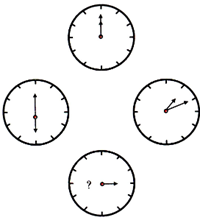 حل: اگر ازساعت بالا شروع و ساعت گرد حرکت کنیم، در هر مرحله به ترتیب داریم عقربه ی ساعت شمار ابتدا 1 ساعت، مرحله بعد 2 ساعت و مرحله بعدی 3 ساعت نسبت به شکل قبلی جلو رفته و می توان حدس زد عقربه ی دقیقه شمار ابتدا 10 دقیقه، بعد 20 دقیقه و در آخری 30 دقیقه جلو رفته است.