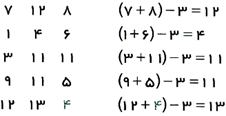 حل: اعداد ستون وسط، 3 تا کمتر از مجموع دو ستون کناری است: