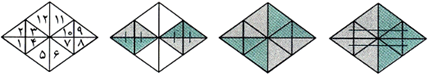 حل: در شکل ۱۲ مثلث یک قسمتی، ۸ مثلث دو قسمتی، ۴ مثلث سه قسمتی، ۴ مثلث شش قسمتی و در مجموع ۲۸ مثلث وجود دارد.