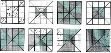 حل: در شکل ۱۶ مثلث یک قسمتی، ۴ مثلث دو قسمتی، ۸ مثلث سه قسمتی، ۴ مثلث چهار قسمتی، ۴ مثلث شش قسمتی، ۸ مثلث هفت قسمتی، 4 مثلث دوازده قسمتی و در مجموع ۴۸ مثلث وجود دارد.