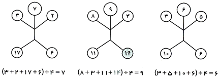 حل: در هر قسمت، عدد بالا میانگین چهار عدد دیگر است: