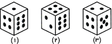 حل: با مقایسه ی اشکال (۱) و (۲) و در نظر گرفتن وجوه تکراری دارای ۴ و ۶ نقطه می توان نتیجه گرفت که وجه روبه روی وجهی که ۲ نقطه دارد، ۱ نقطه دارد.
