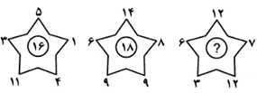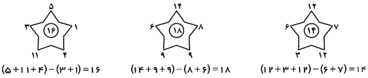 حل: در هر ستاره، مجموع عدد بالایی و دو عدد پایینی از مجموع دو عدد دیگر کم شده و عدد وسط به دست آمده است: