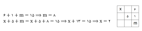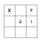 در مربع جادویی داده شده، مجموع اعداد هر سطر یا ستون یا قطر، 15 می‌باشد. مقدار برابر است با: